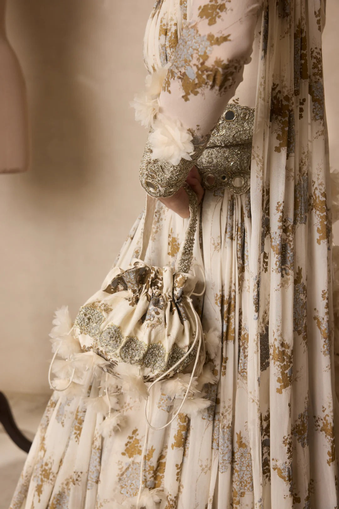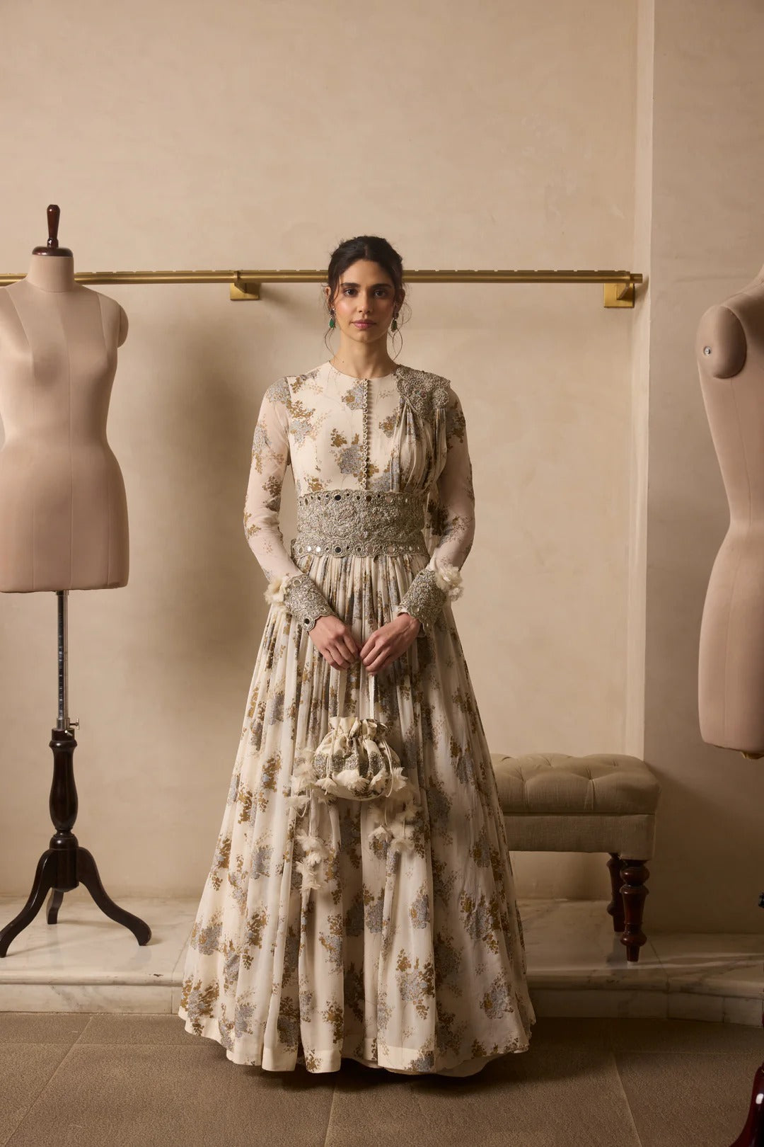 The Twila Anarkali is cut from soft satin georgette in a vibrant fuchsia and detailed with all-over floral foil printing. A sheer, embellished neckline and waist embroidery elevate the silhouette, while the gathered skirt moves effortlessly with every step. The attached cape drapes fluidly from the shoulders for a look that feels both ethereal and modern