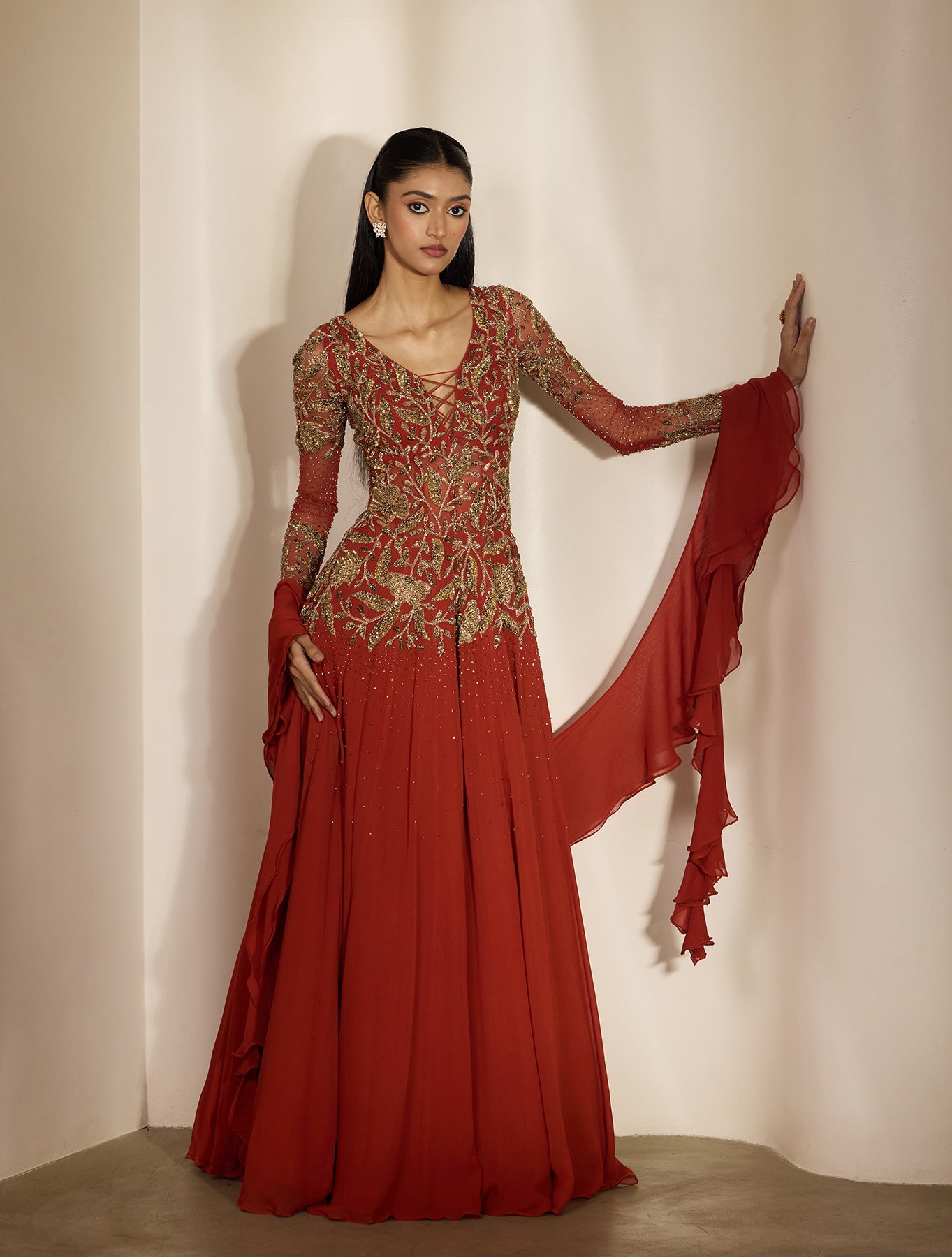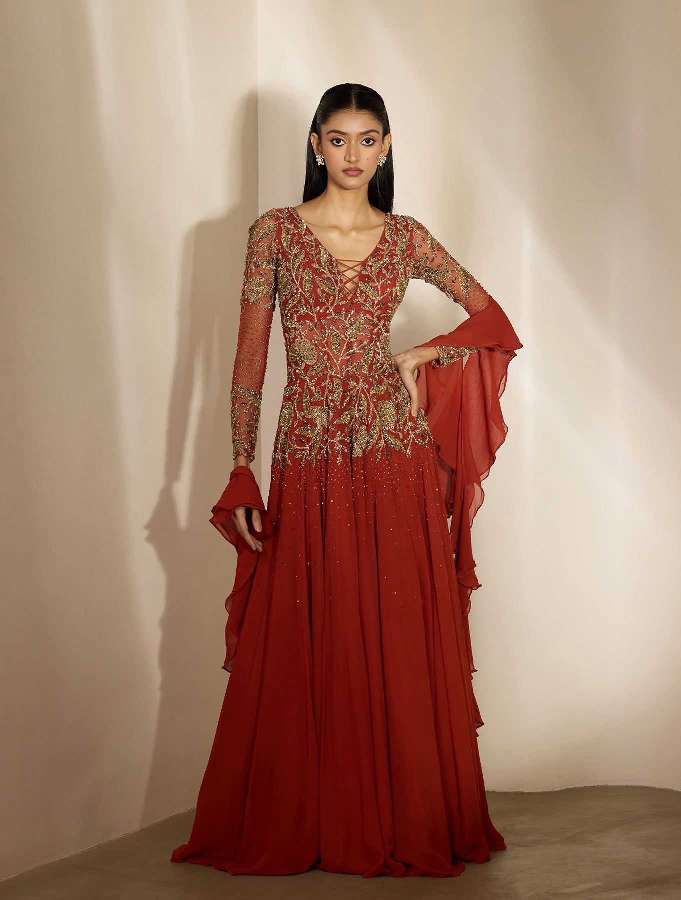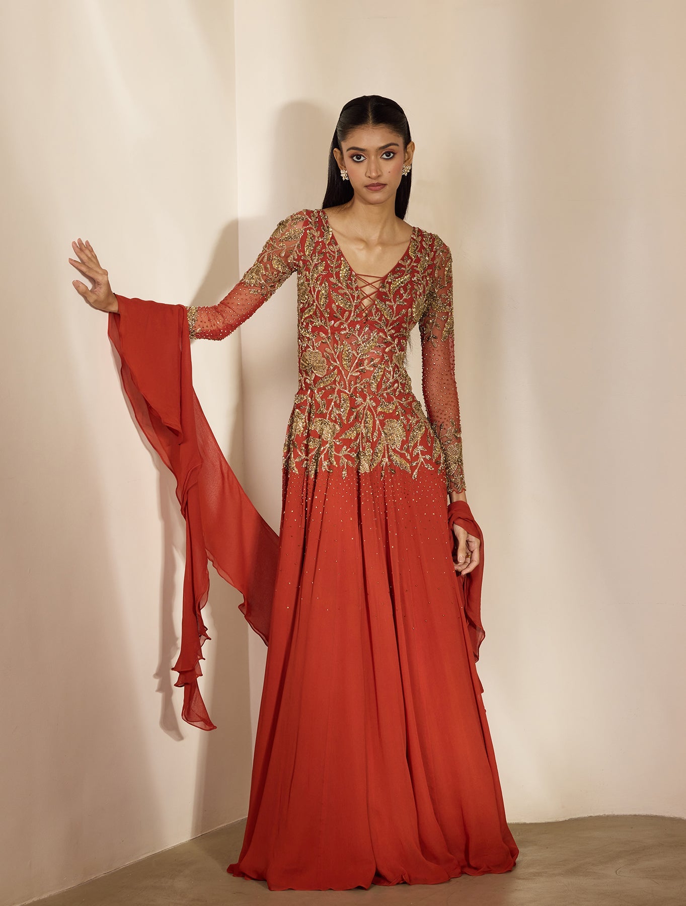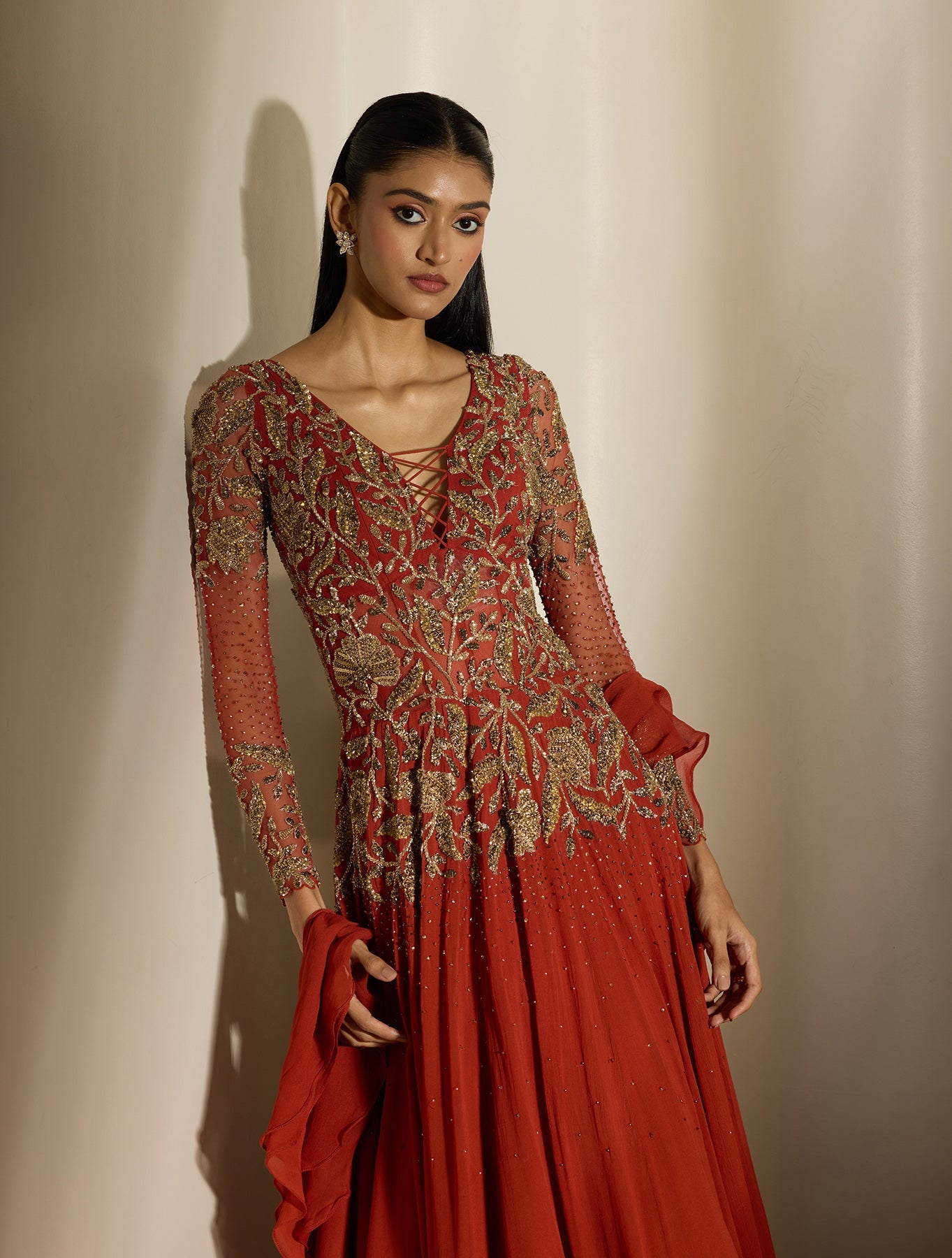 Red anarkali with a long, fluid sweep and subtle flare. The yoke is tailored to frame the neckline while tonal embroidery keeps it luxe. Lightweight dupatta, easy twirl-factor. Romantic with range.