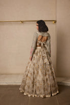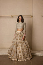 A luminous blend of structure and fluidity. The Essie Lehenga is crafted from sheer ivory organza with all-over floral sequin embroidery in antique gold and silver. The cropped blouse is hand-embroidered with tonal threadwork, featuring a soft boat neckline, full sleeves, and a striking open back finished with a bow tie. A high-waisted, softly pleated skirt completes the look with an effortless, sculptural silhouette.