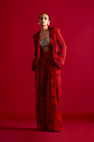 Indulge in the bold allure of this ensemble featuring a captivating red and black blossom-print jacket. Expertly paired with matching trousers, this striking set commands attention. A meticulously embroidered bustier enhances the outfit, adding an element of luxury and refinement. This ensemble is a stunning embodiment of fashion-forward sophistication.