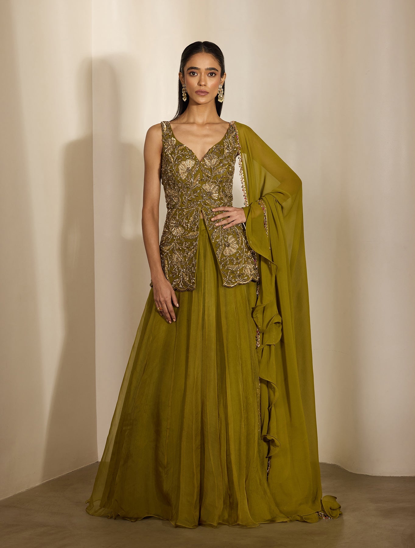 Olive lehenga with easy volume and a fitted blouse—it’s the soft-structure moment. Subtle embroidery skims the hem for a hint of detail, while the skirt keeps it floaty and light. The neckline is tailored-clean for layered jewels or none at all. Statement, minus the fuss.