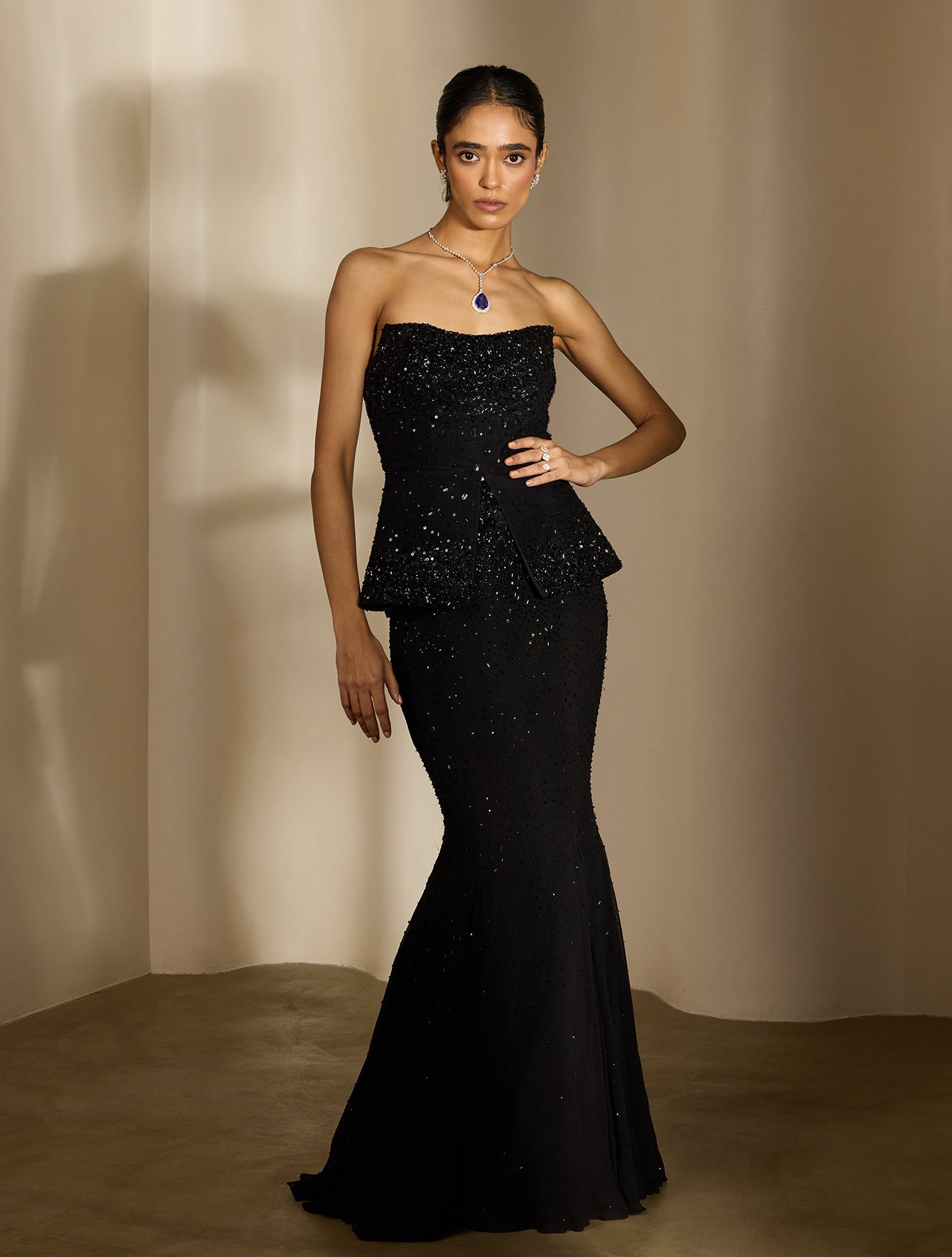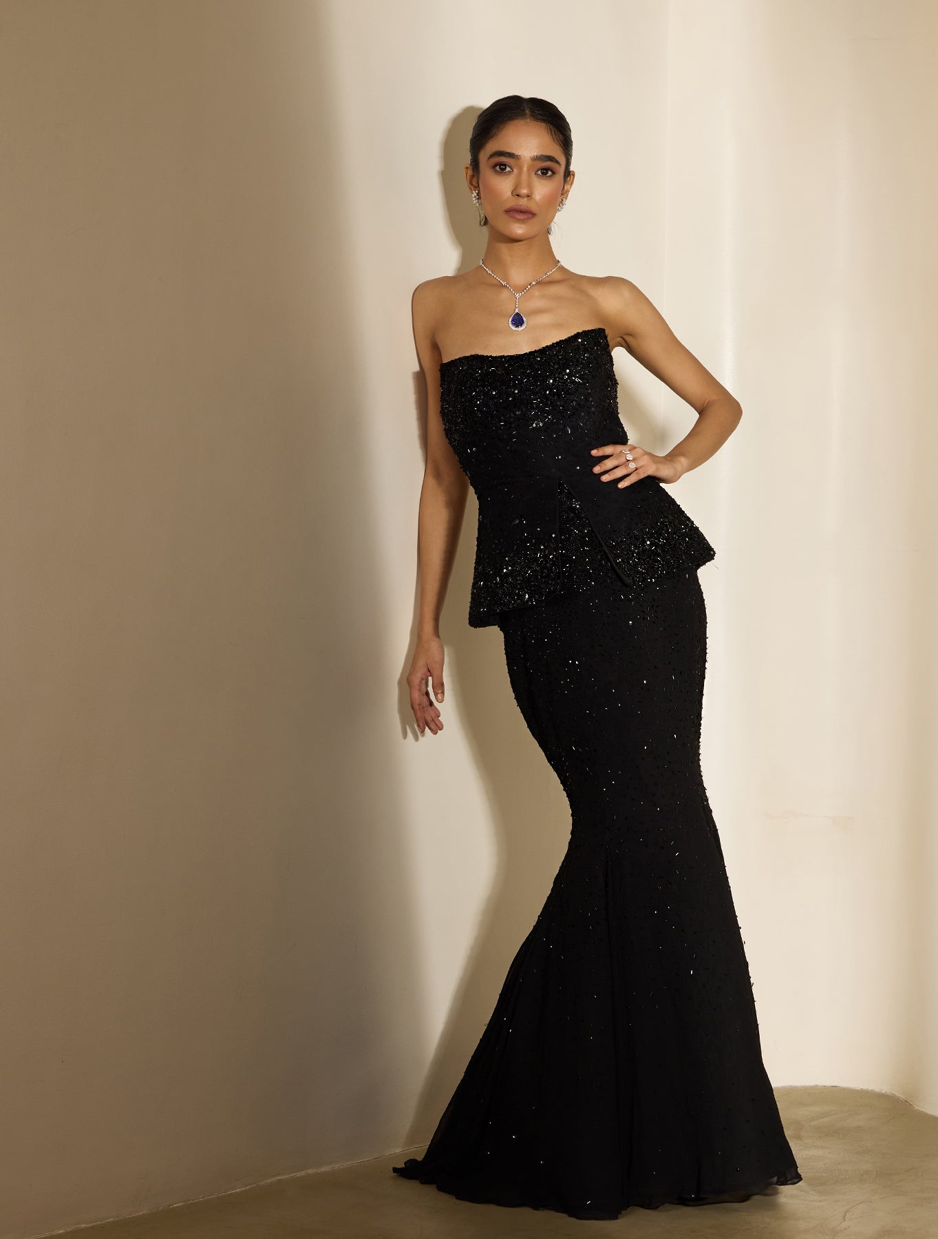 Black lehenga with a clean, swishy skirt and contoured blouse. Quiet sparkle along the seams adds dimension. Powerful and pared-back.