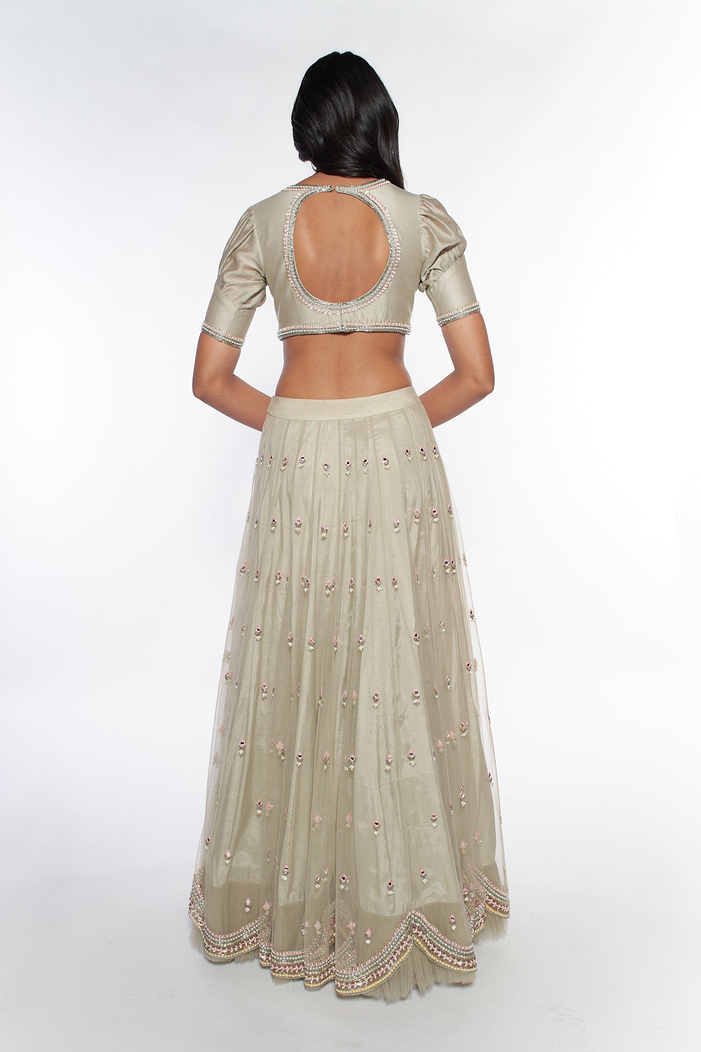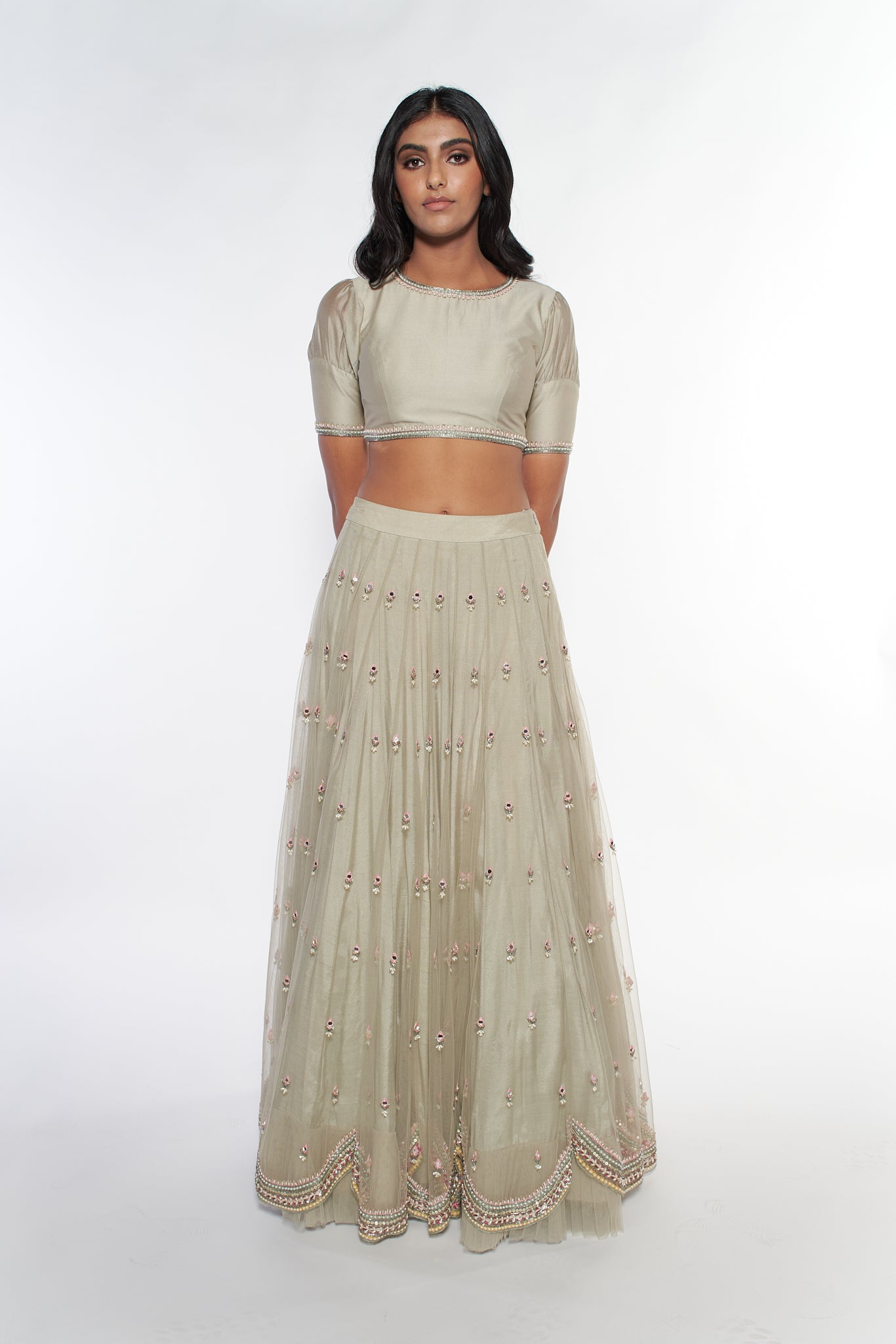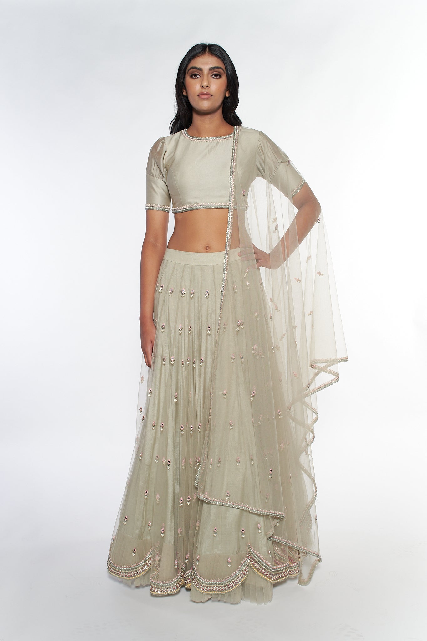 Gray embroidered crop top with puff shoulders. Layered net skirt with mirror work and scallop border. Net dupatta with matching mirror work and embroidered border.