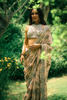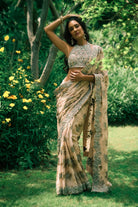 Rich and romantic. This saree is cut from fluid georgette and hand-embellished with soft florals that shimmer with movement. The sculpted halter blouse, adorned in tonal glasswork, adds definition to the otherwise weightless drape.