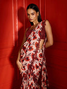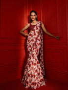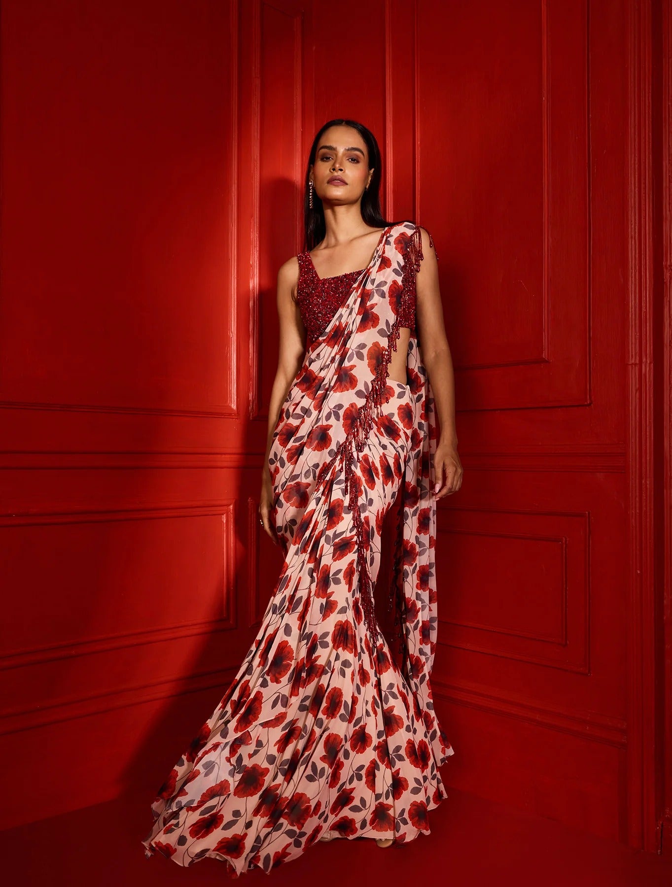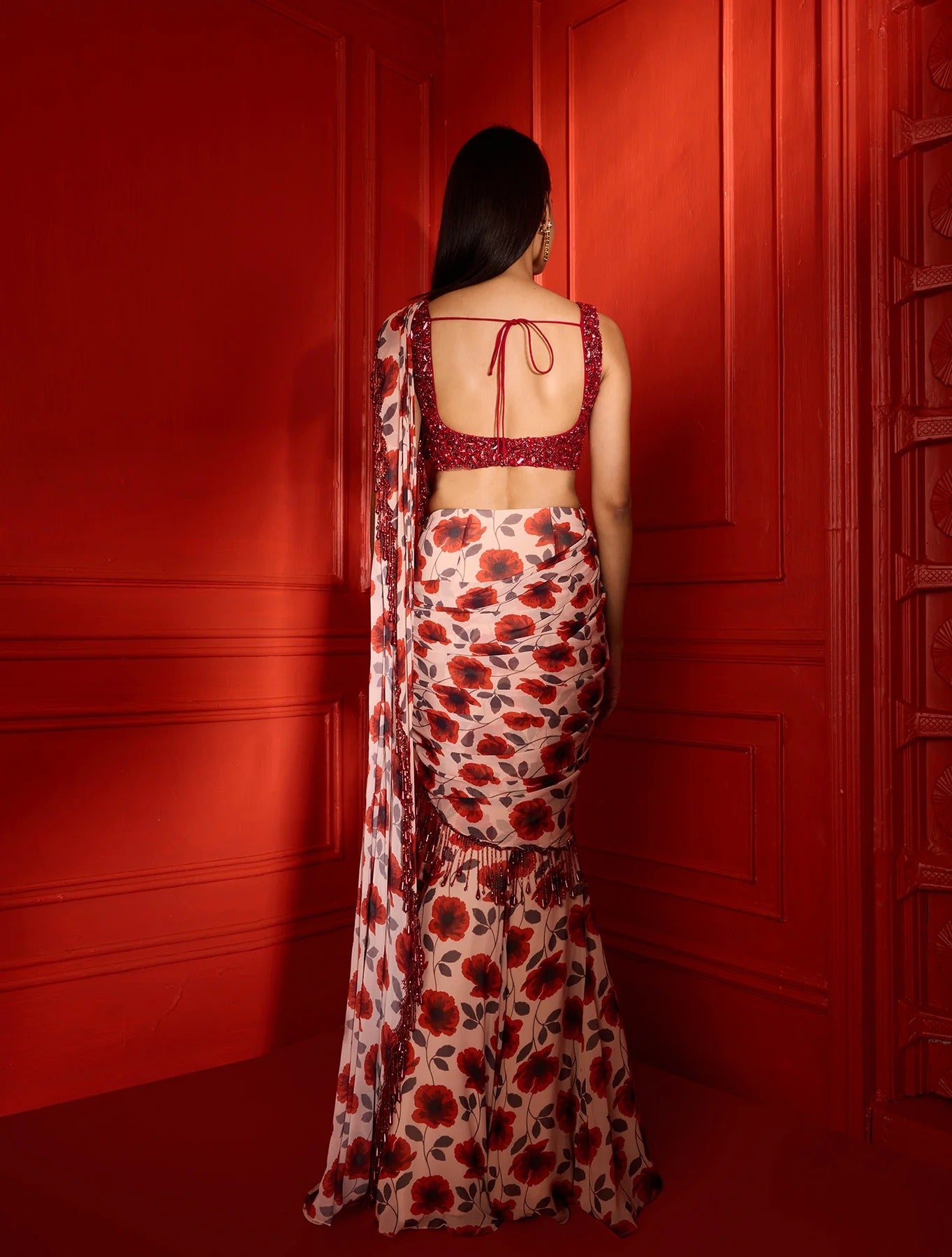 Statement-making, from every angle. This floral chiffon drape set features a mermaid-cut skirt paired with a fully hand-embroidered blouse. Layered fringe beading adds extra texture and drama, while the soft pleats and curved drape bring all the movement.