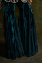 This sharara set stuns with sculpted cut-outs, intricate zardozi embroidery, and dramatic flared pants. A modern silhouette that delivers high impact with minimal effort.
