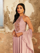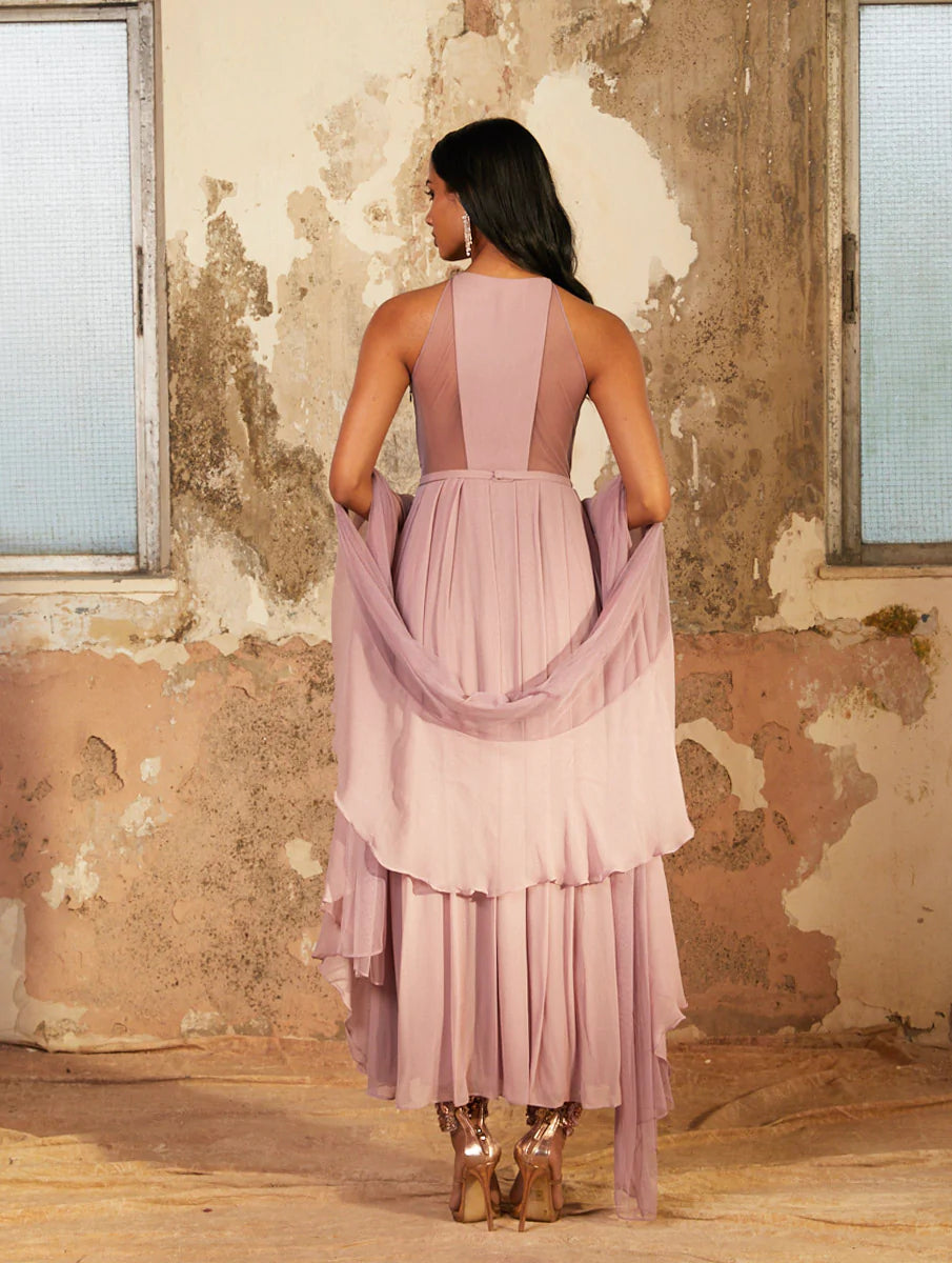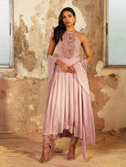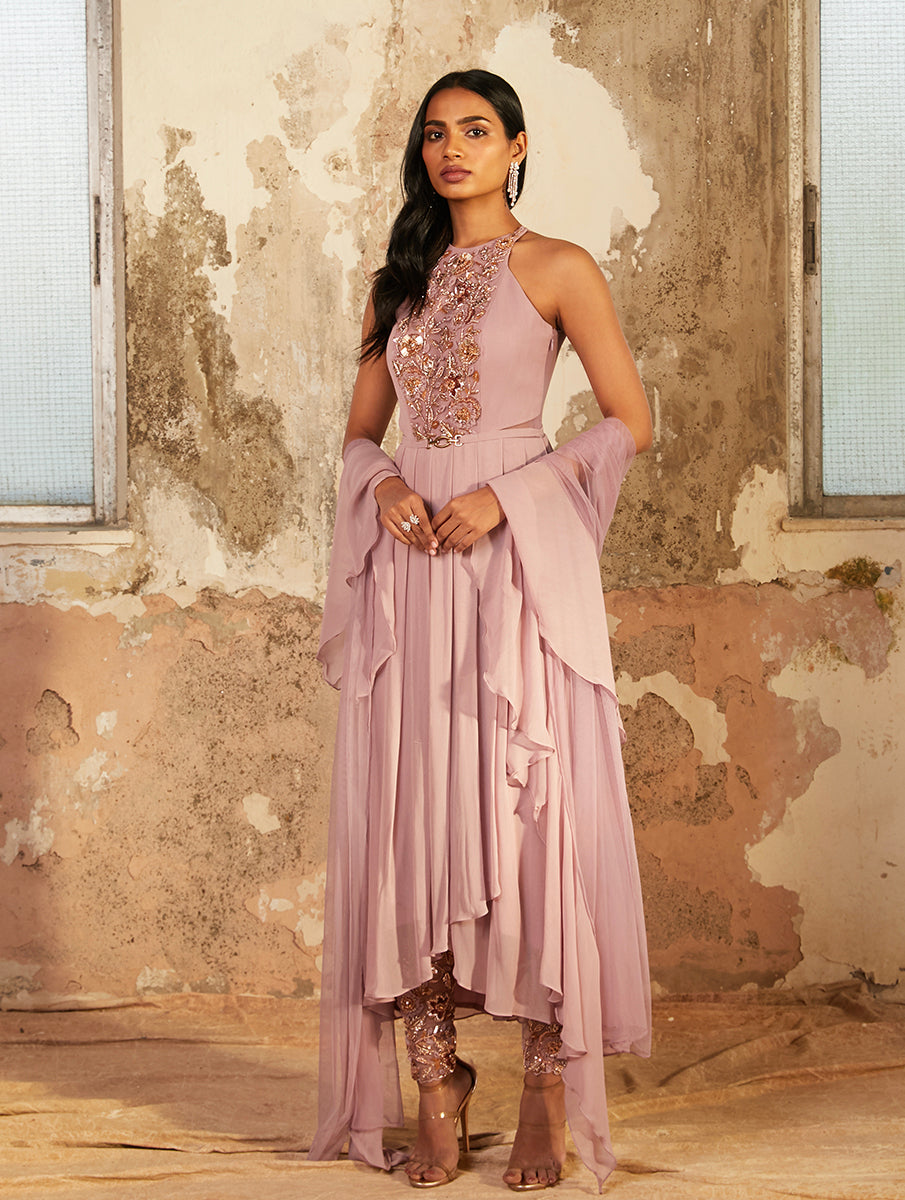 Lilac, overlap-pleated kurta featuring 3D gold embellishments on front yoke and a matching sheer embellishments on pants. Paired with a ruffle dupatta.