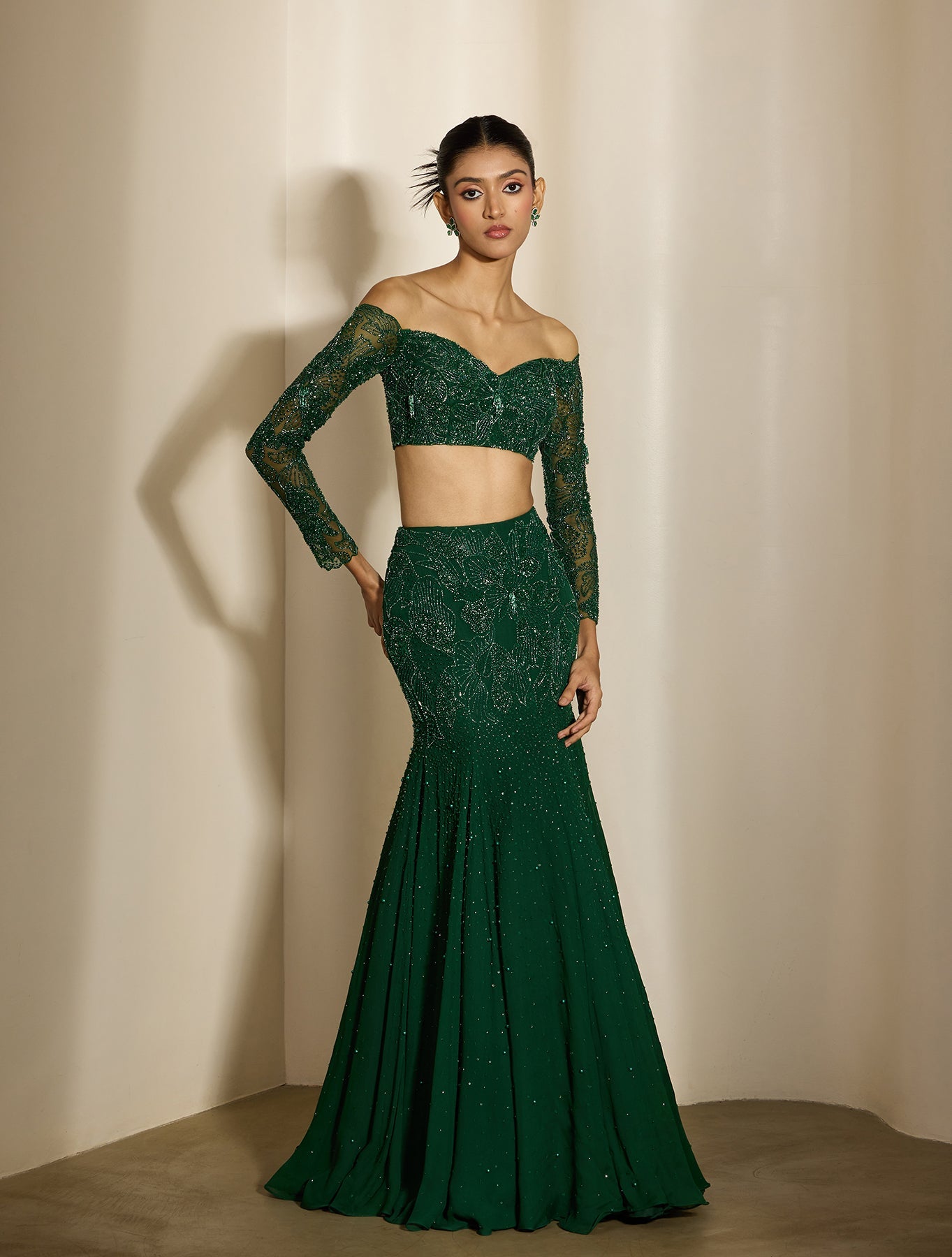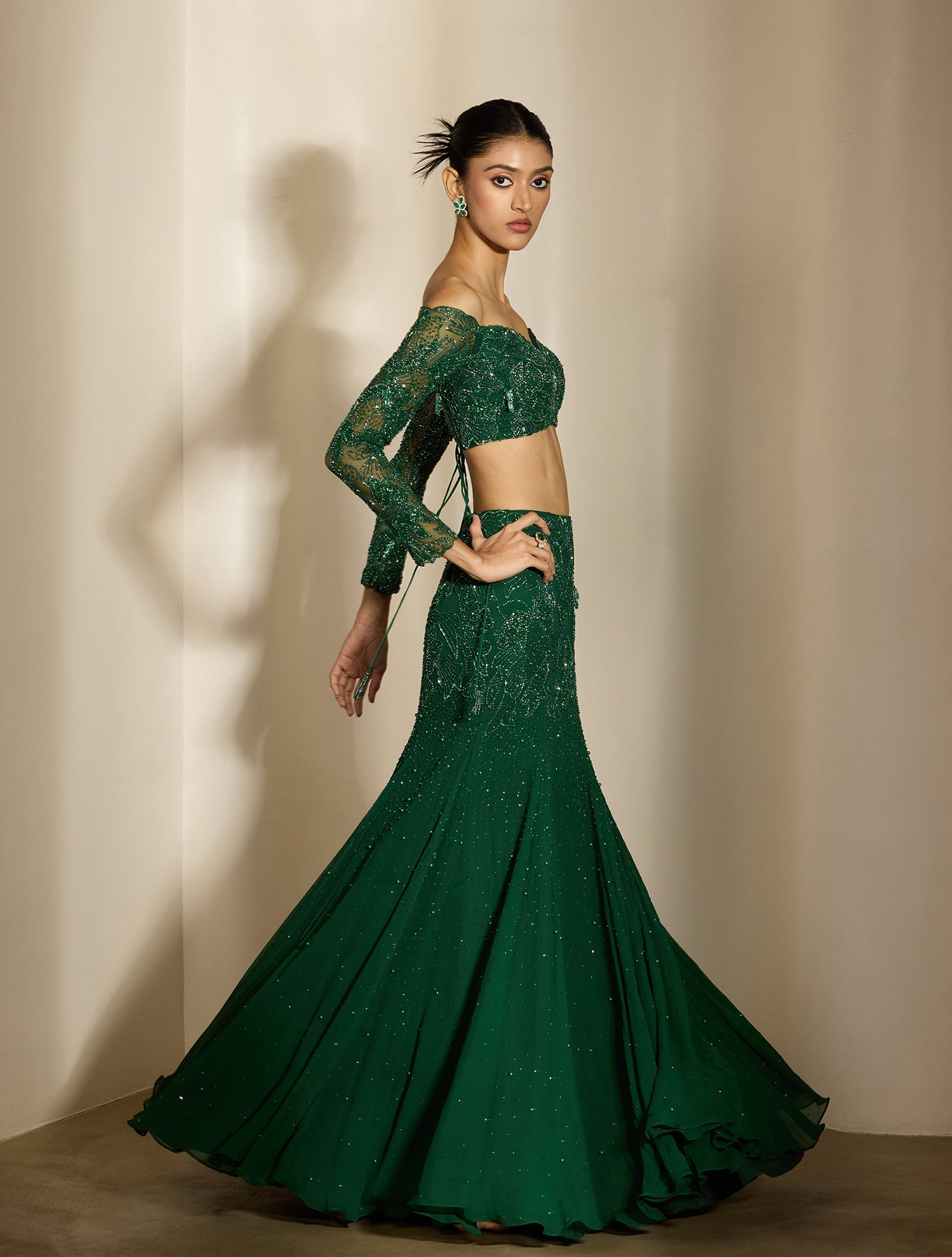 Emerald‑green saree with sheer pallu and satin‑clean lines. Understated border work keeps it refined. Style with gold for warmth or silver for edge. Luxe minimalism, turned up.