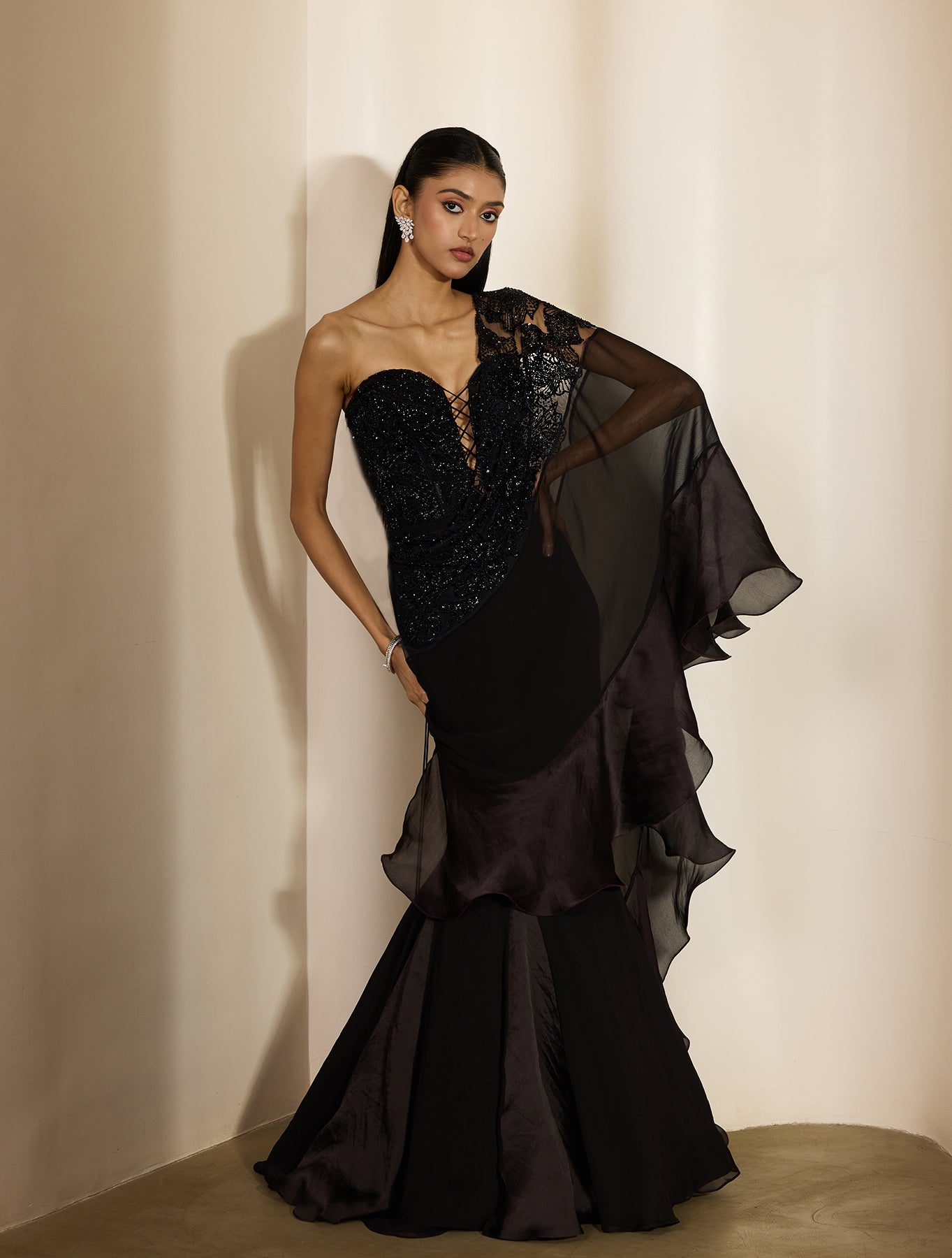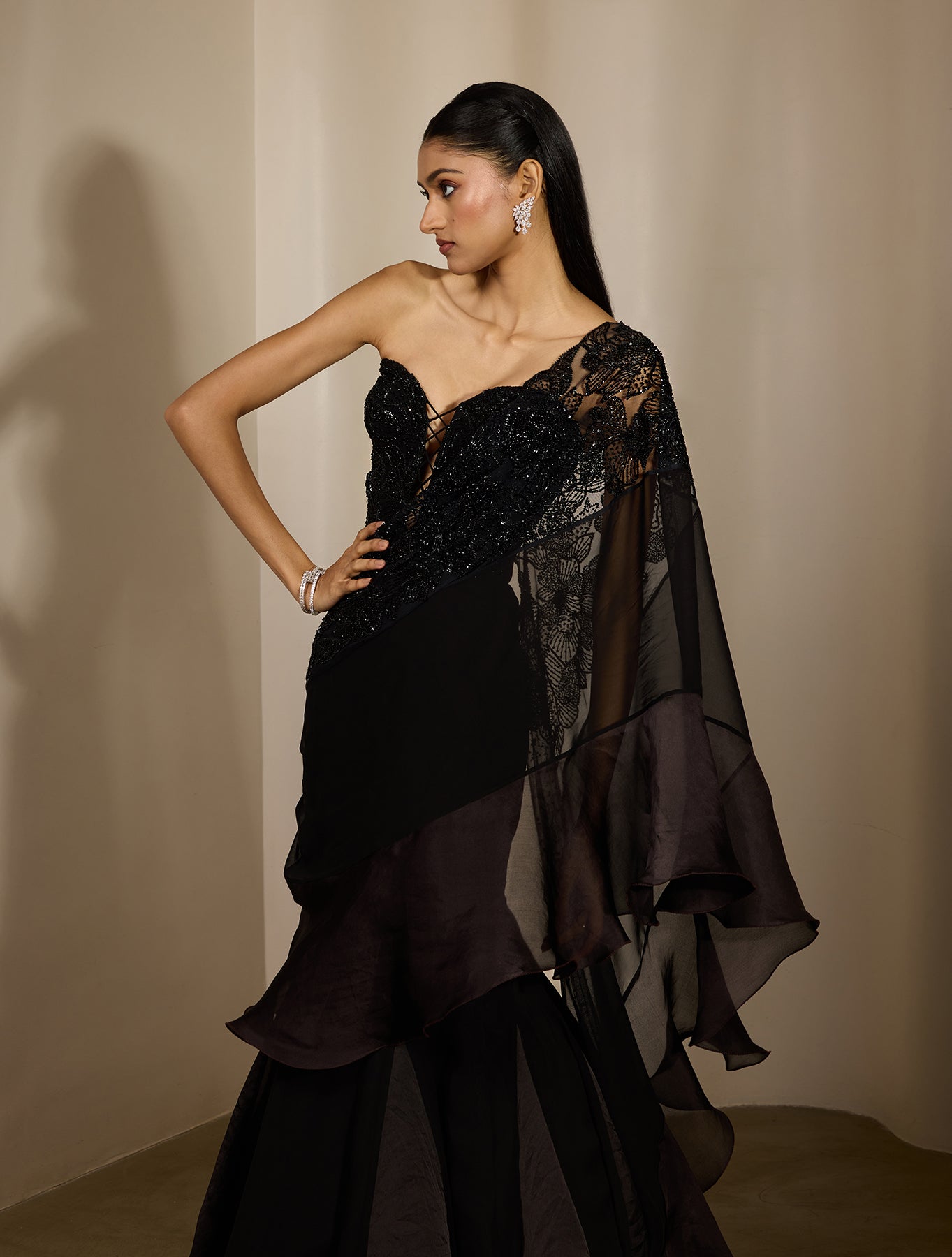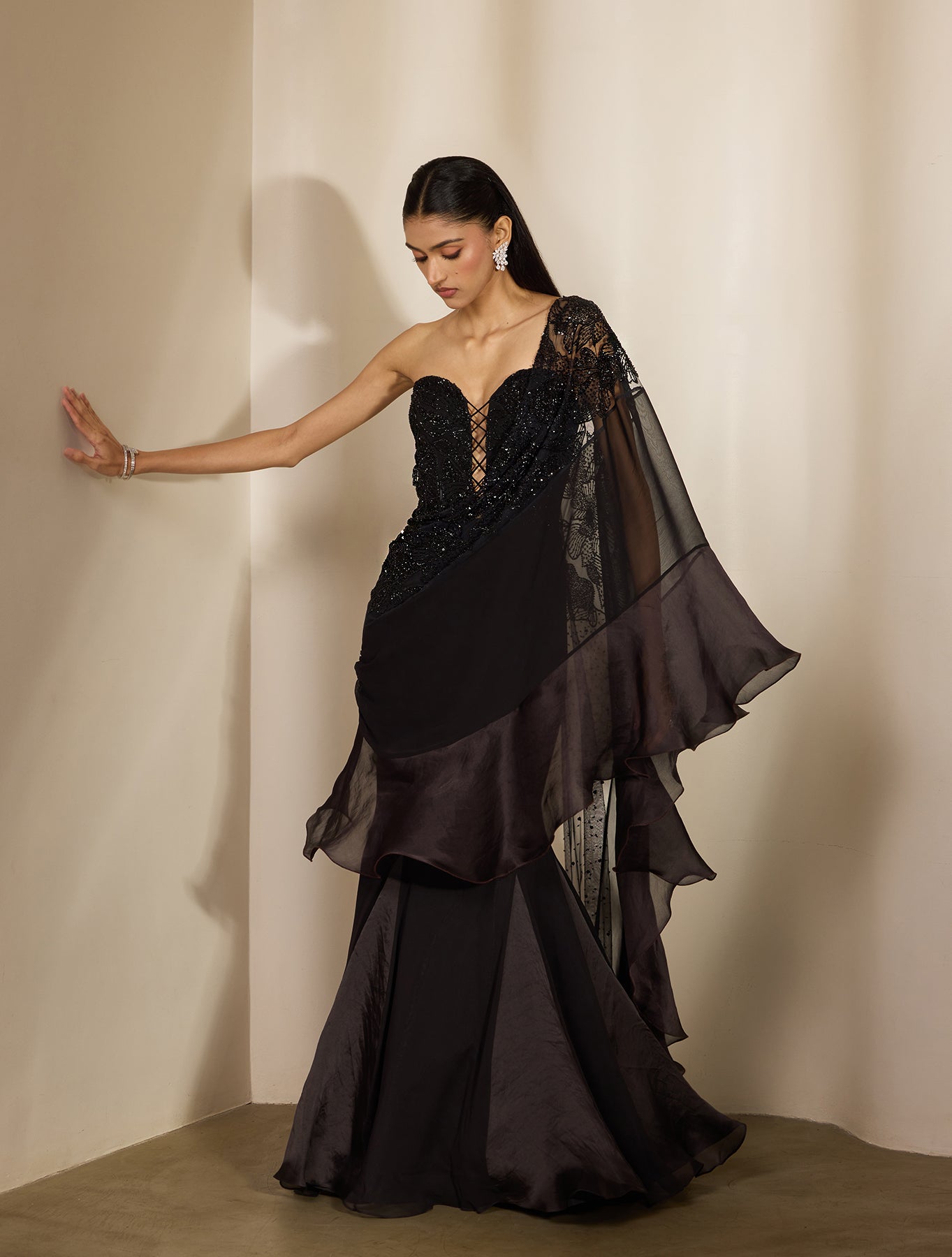 Black saree with a liquid drape and razor-sharp blouse lines. Tonal detailing at the border keeps it elevated. Monochrome that’s anything but basic. After-dark essential.