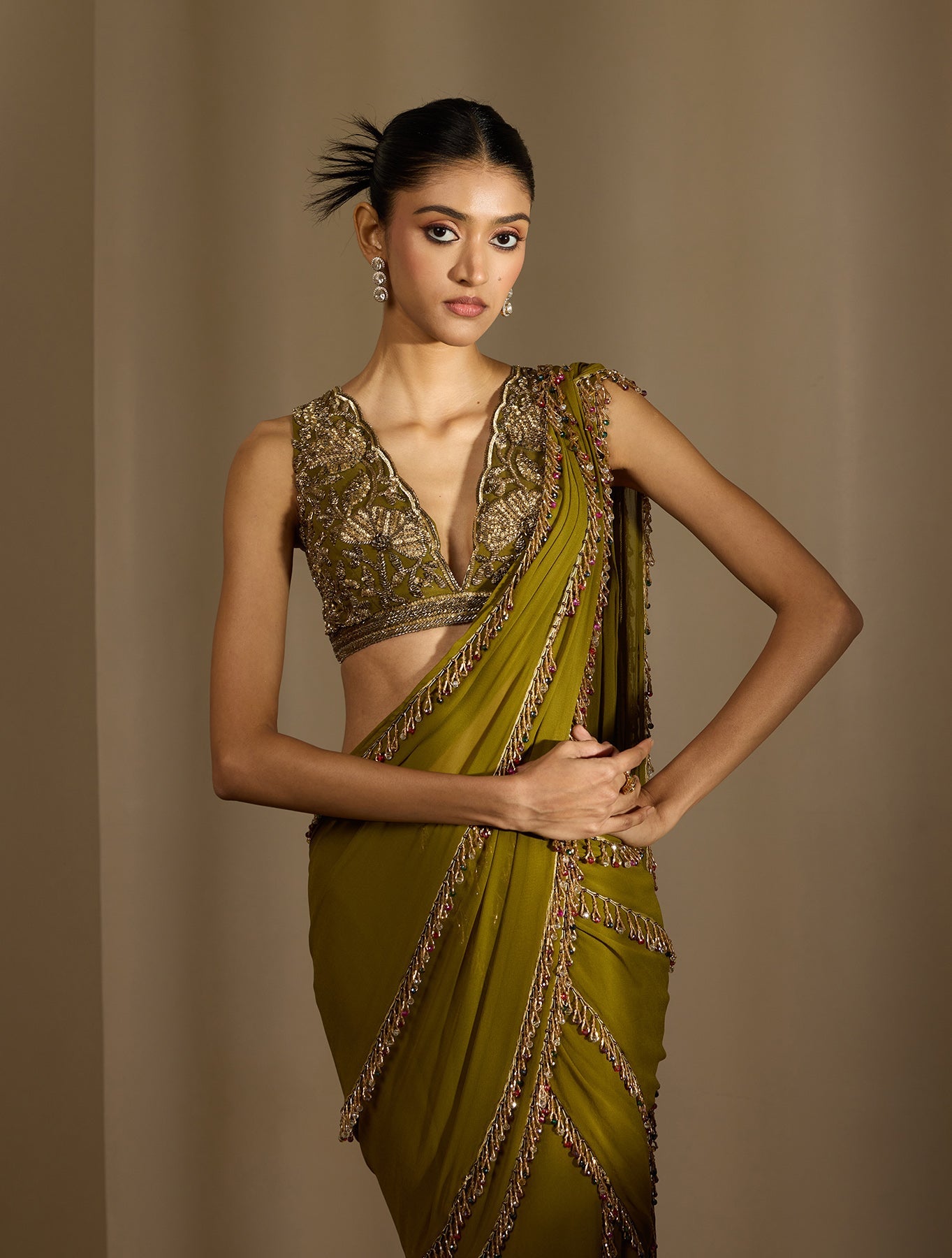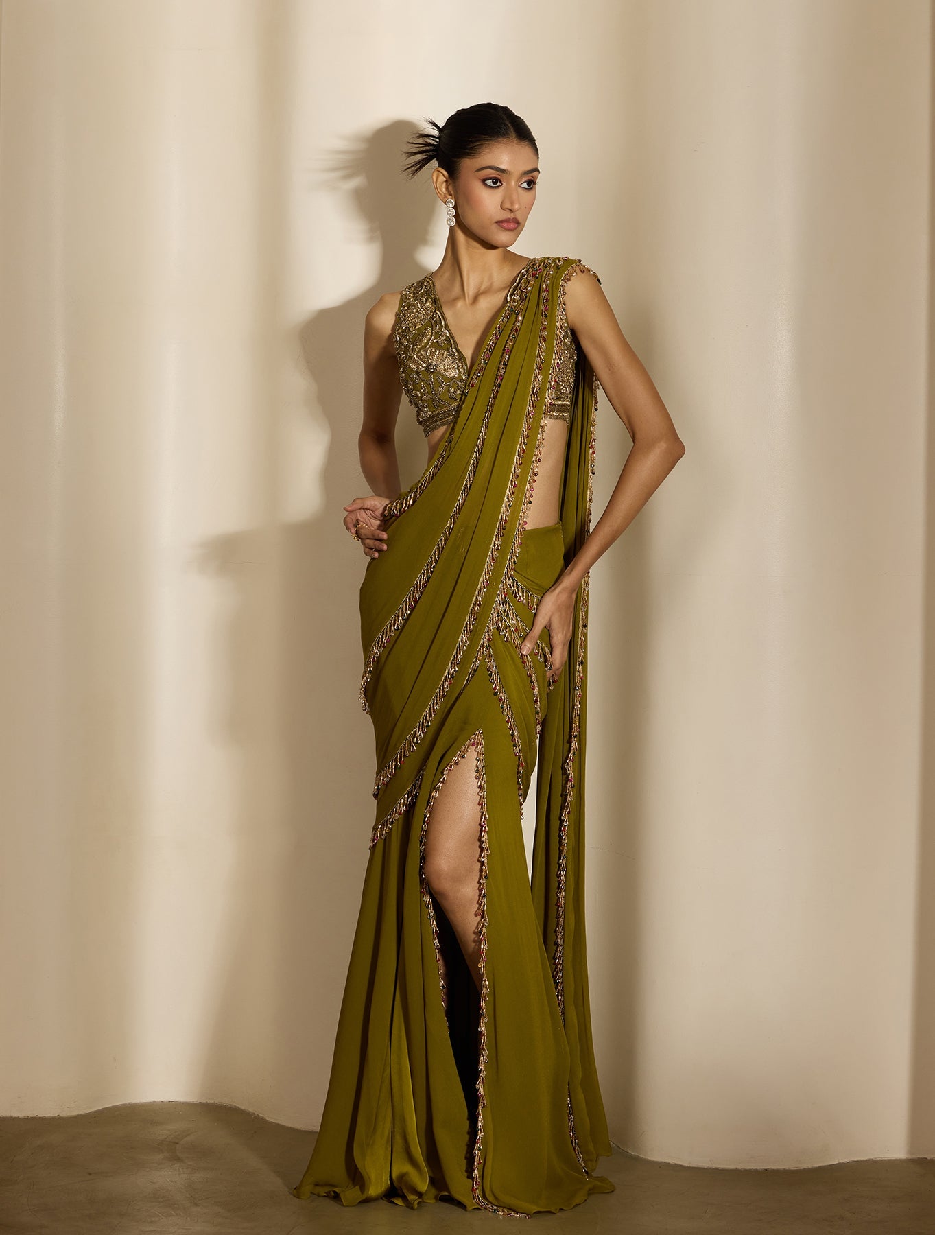 A fluid olive saree that drapes like a dream, paired with a sculpted blouse for a clean, modern line. The thigh-high slit gives it a bold, confident edge while keeping movement effortless. Hand-finished edging adds subtle texture without stealing the spotlight. Minimalist, but never quiet.
