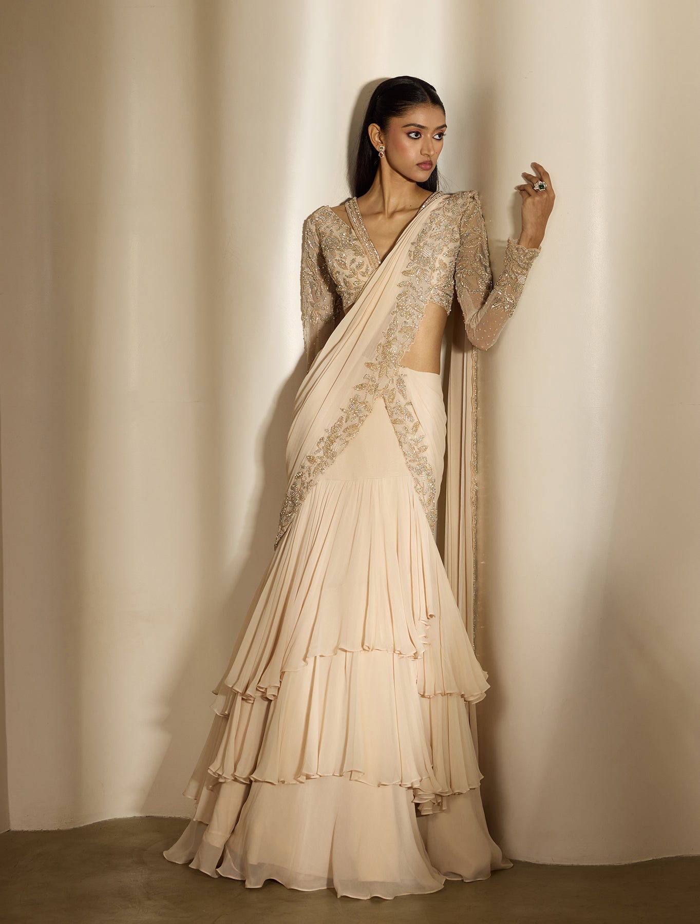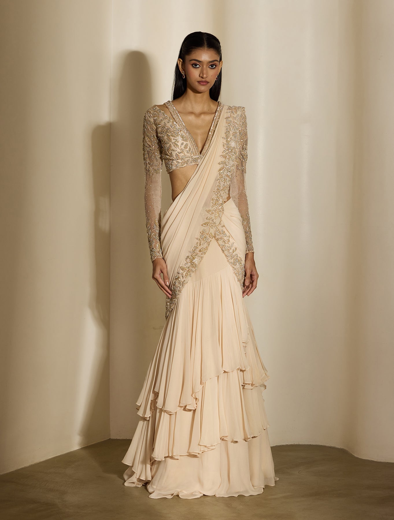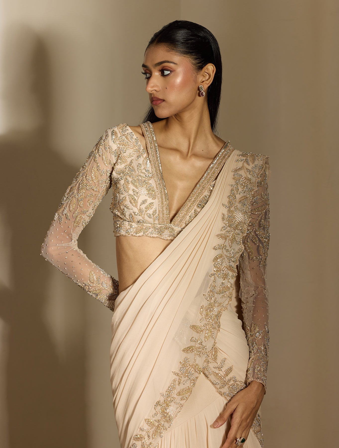 Beige saree with an ultra-fluid fall and a tailored blouse. A trimmed border gives quiet definition. Layered neutrals keep it luxe and versatile. Minimalist, but never plain.