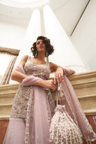 A soft lilac shimmer sets the tone for this dreamy ensemble. The intricately hand-embroidered shirt features silver threadwork and tonal bead detailing, paired with a flared sharara Finished with a scalloped dupatta and delicate beaded edging, it's equal parts refined and romantic.