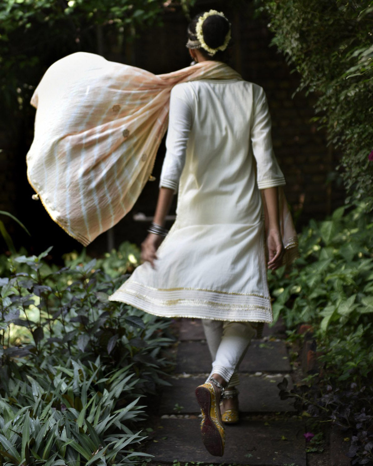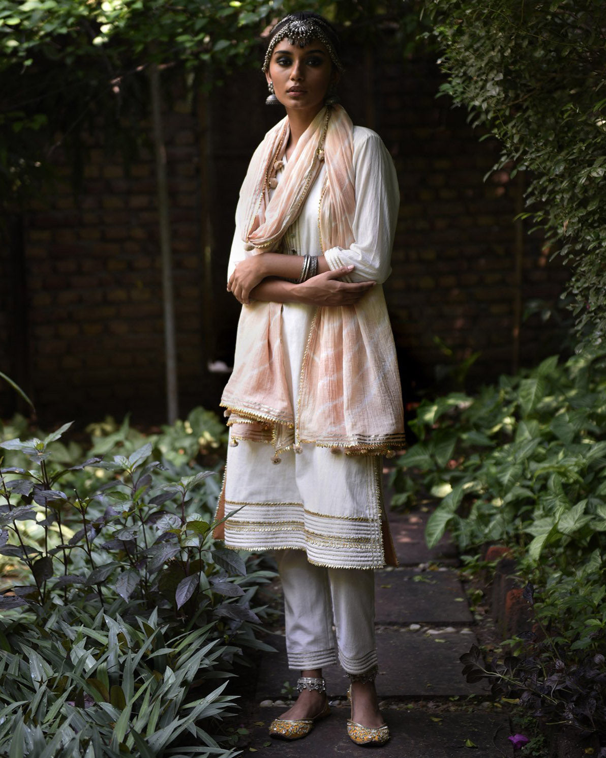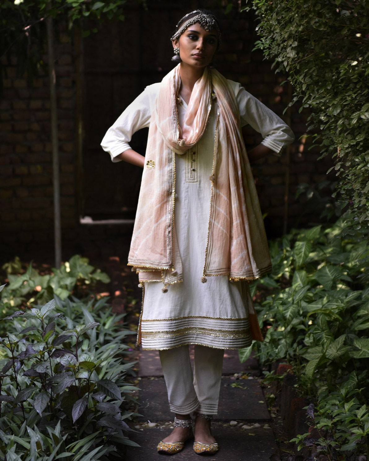 Dupatta: Pale-pink, leheriya dupatta with pom poms and gota finishing.
