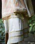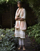 Kurta: Ivory kurta with silver button down work on the chest. Gold gota finishing along bottom and sleeves.