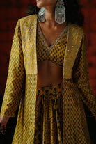 Cut from lightweight fabric in a marigold tone, this three-piece look is block-printed by hand and features delicate mirror and thread embroidery. The full-sleeve jacket is lined with tonal floral motifs, adding structure and subtle sparkle, while the V-neck blouse and fluid skirt balance comfort and statement. Pair it with silver jewels for an effortlessly dramatic moment.
