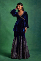 This standout silhouette brings a fresh edge to festive wear. Crafted in plush velvet, the peplum-style top features a flattering wrap neckline with delicate hand-embroidery. The godet pants add drama with their flared, panelled finish.
