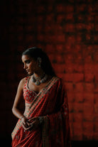 A statement in effortless elegance—this saree is crafted in luxurious dupion silk and hand-embellished with delicate motifs and metallic accents. Finished with a patterned border and paired with a sculpted blouse, it’s designed for modern celebrations steeped in tradition.