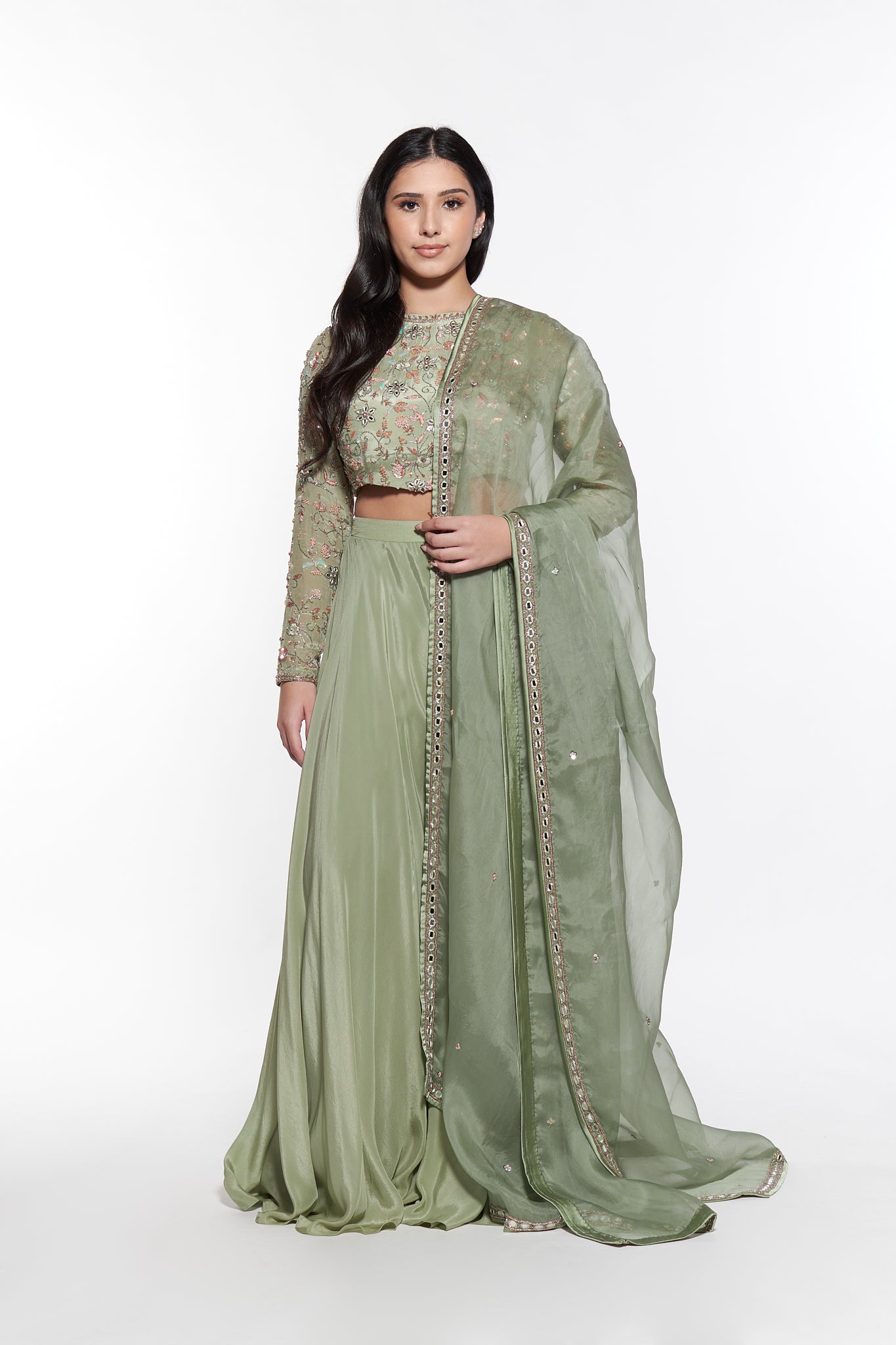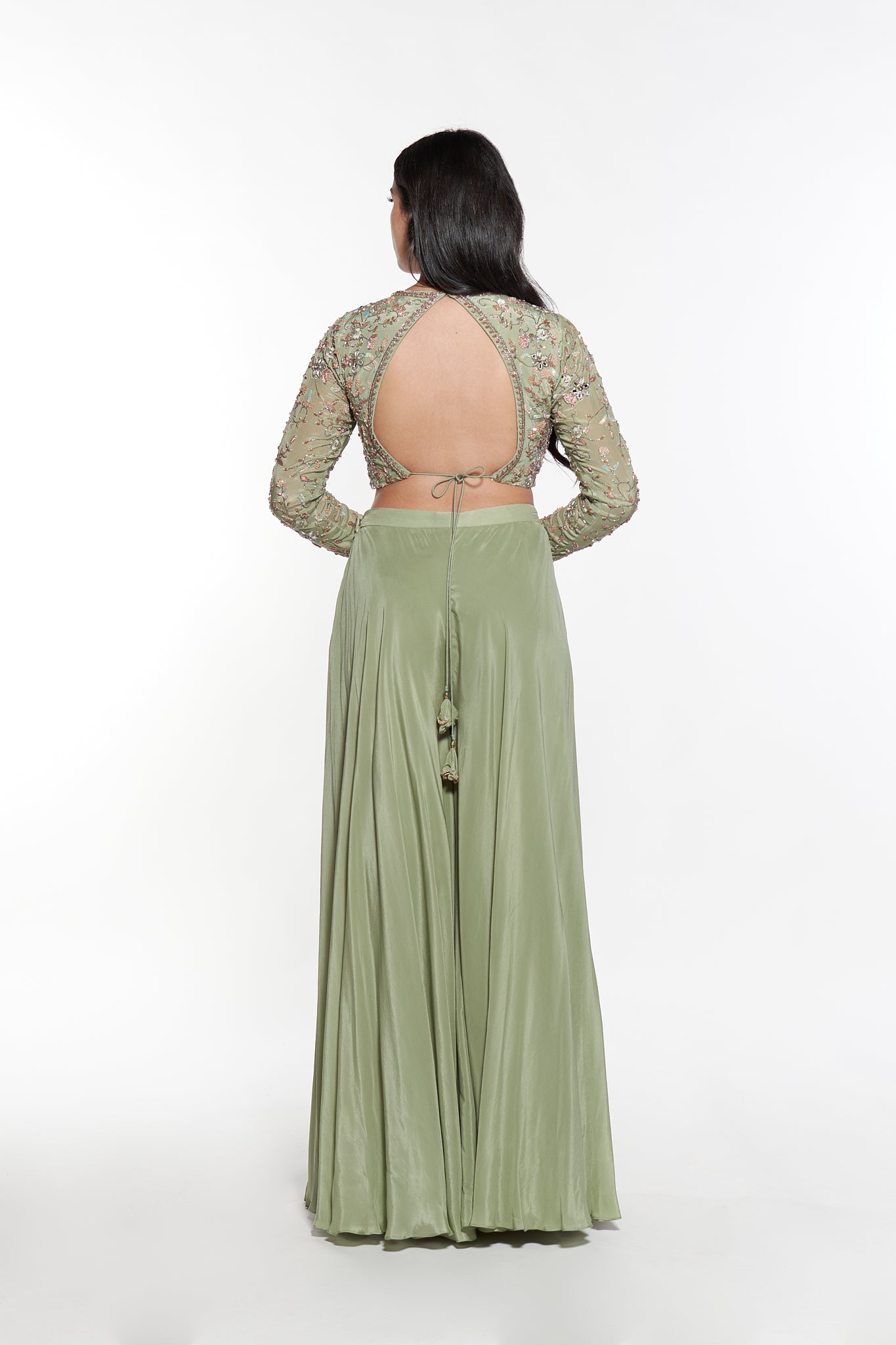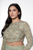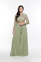 Elevate your style with the Cabo ensemble. An hand embroidered crop top featuring an open back and intricate floral motifs. The flowy palazzo pants and lightweight dupatta provide both comfort and style. Perfect for any occasion.