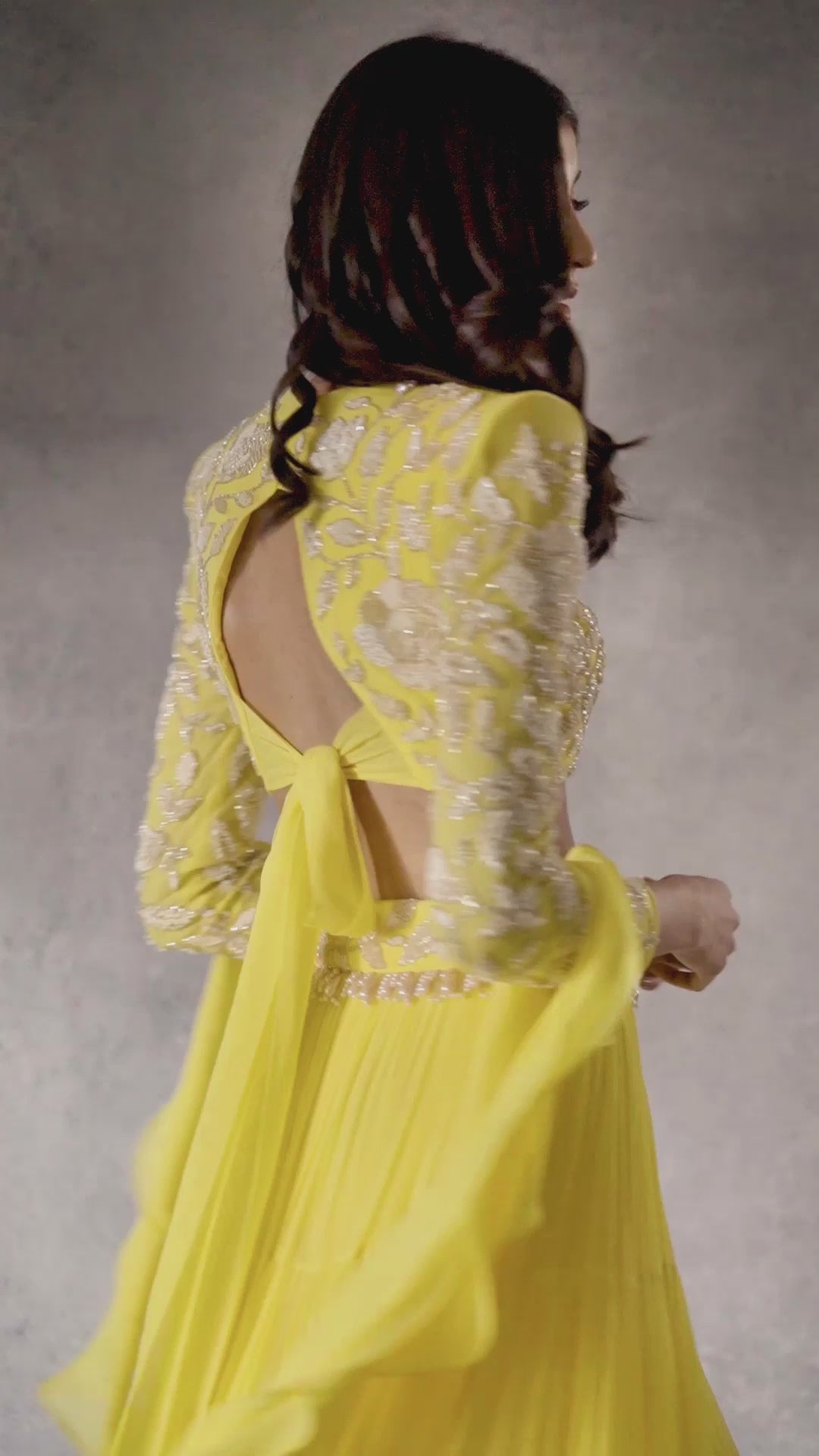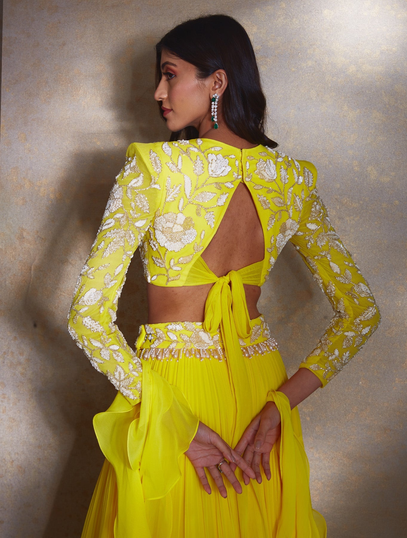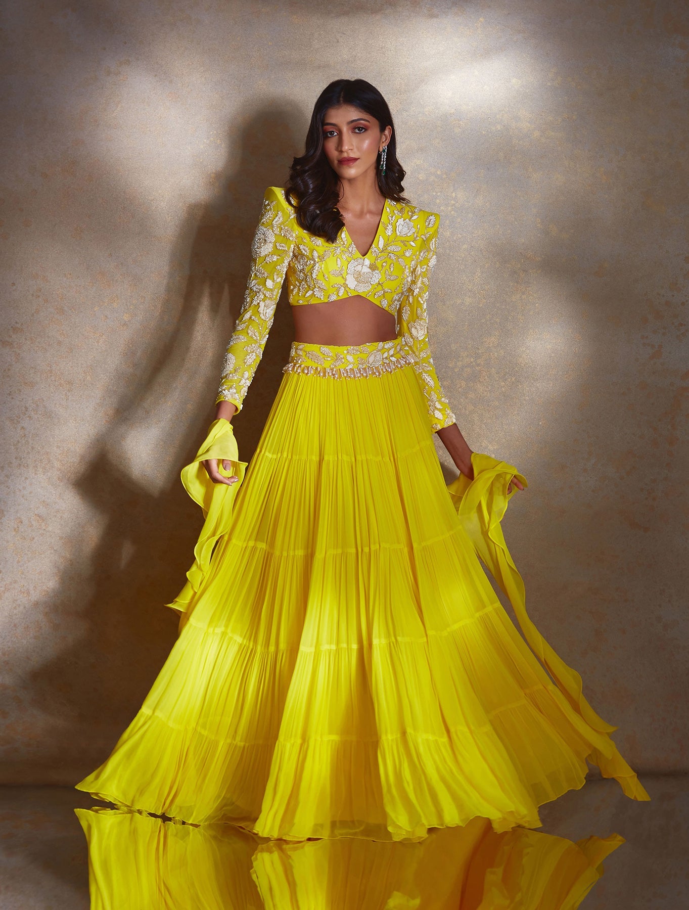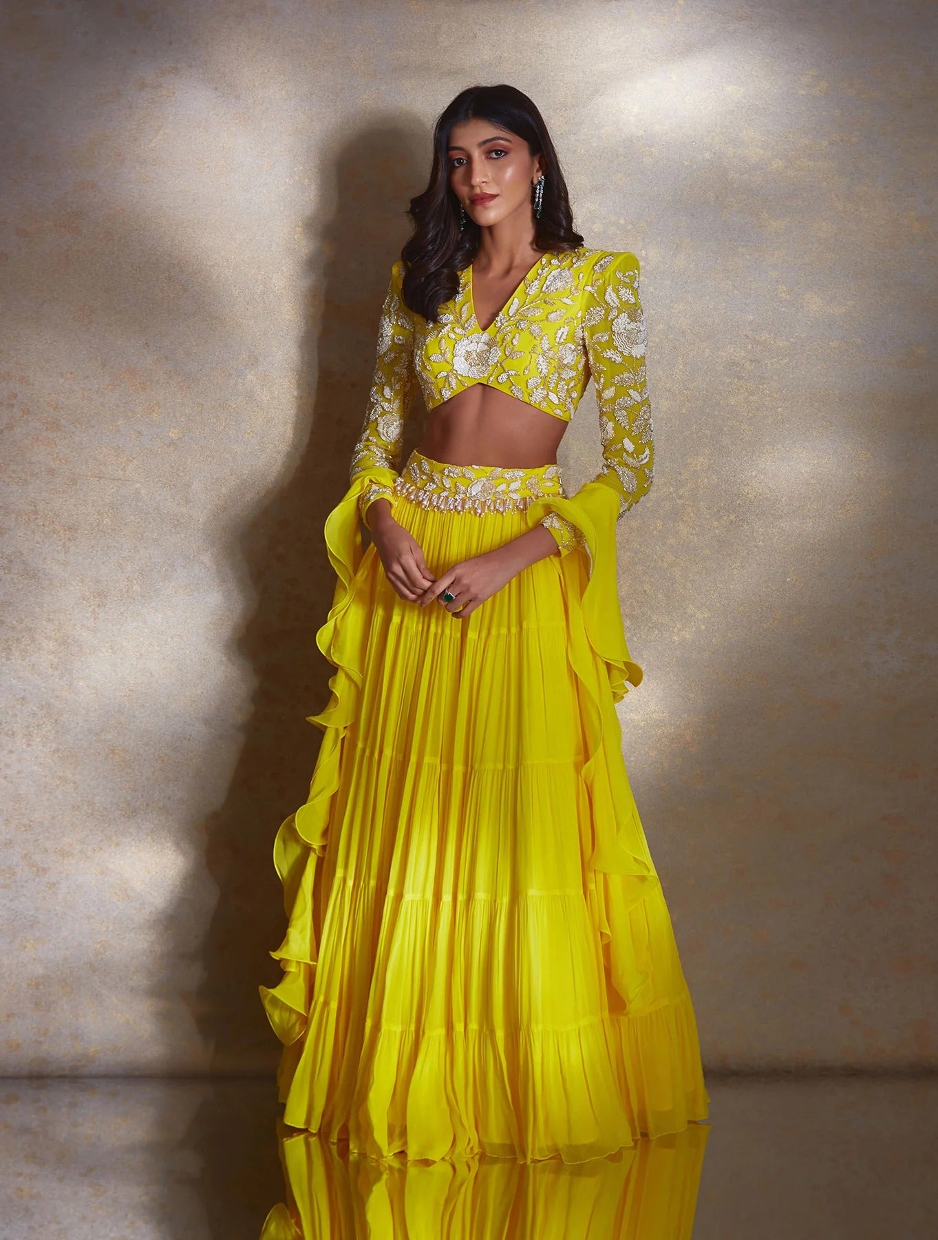 The Ellen ensemble features a vibrant yellow crop top with a powerful shoulder detailing and ivory camellia flowers. It is styled with a tiered georgette lehenga featuring an embellished waistband. Complete with a modest ruffle dupatta.