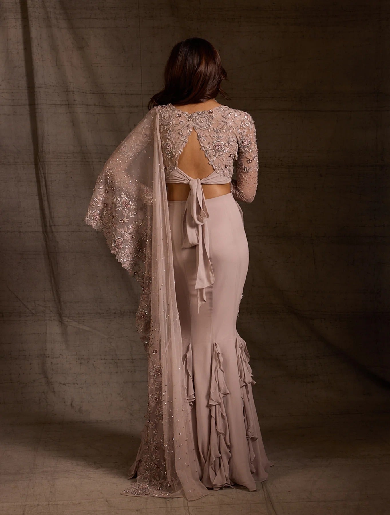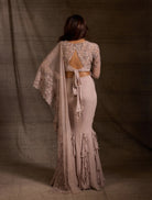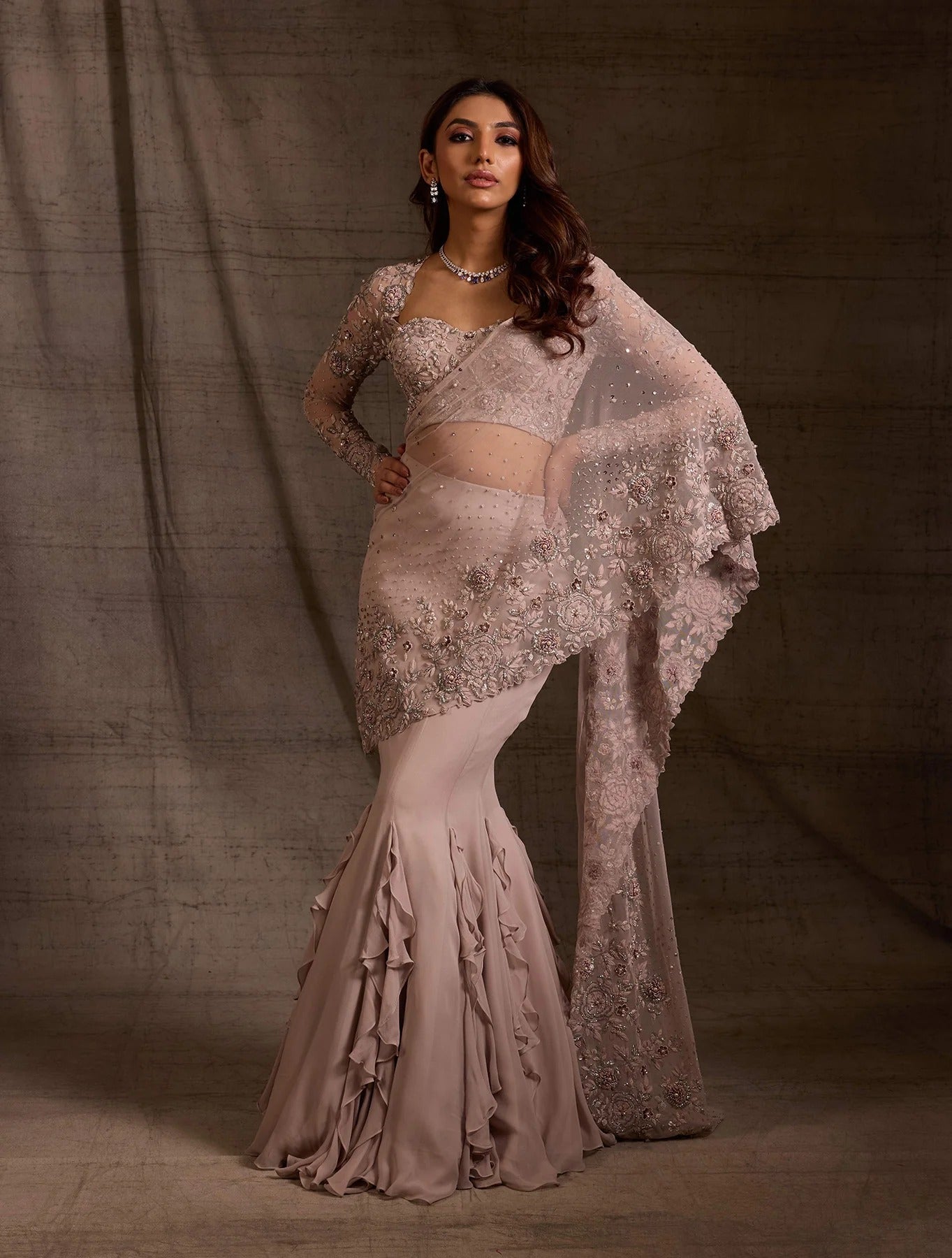 Crafted in a soft blush beige, this saree gown blends structured draping with a fluid silhouette. The embroidered mesh blouse features hand-applied floral detailing and a flattering sweetheart neckline. Cascading ruffles and delicate pearl work give the georgette skirt a feminine finish.