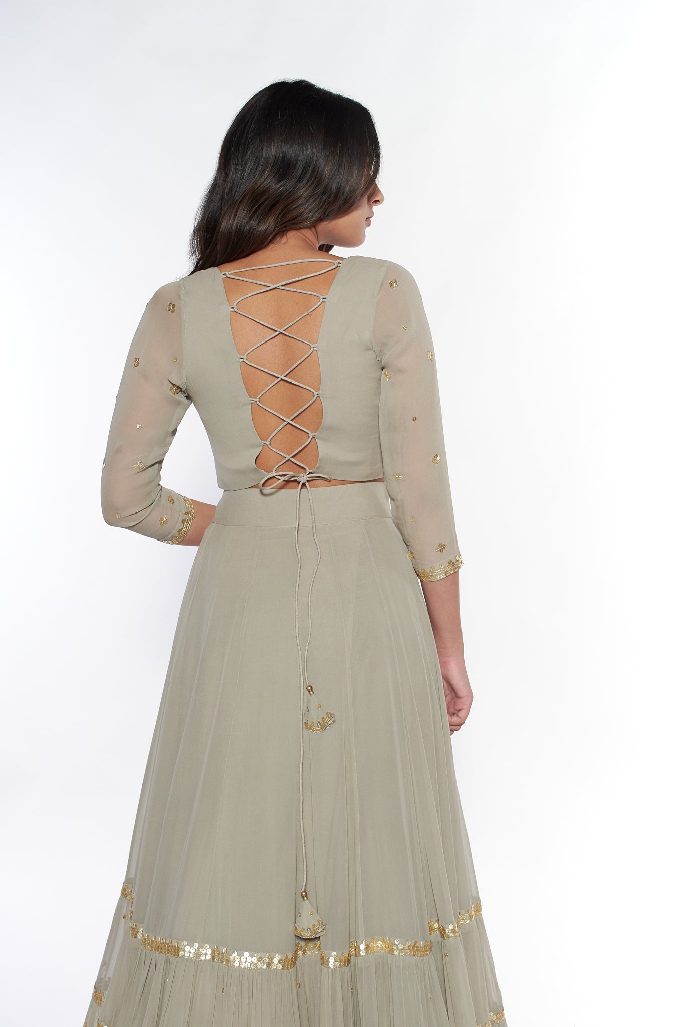 Gray crop top with sequin-embroidered sleeves and criss-cross back. Paired with tiered, georgette skirt and net dupatta with matching hand embroidery