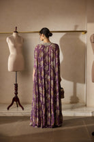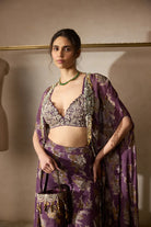 Cut from lightweight georgette in a rich plum tone, this three-piece set brings together comfort and couture. The flared trousers feature an all-over metallic floral print, mirrored in the airy cape with beaded detailing at the shoulders. Paired with an intricately hand-embroidered bralette.