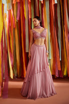 A beautiful 3D flower, tonal-embroidered blouse with off-shoulder neckline. It is paired with a skirt with biased panels. Complete with pleated dupatta.