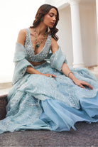 Elevated elegance. Cut from pure silk organza, this powder blue lehenga is hand-embroidered with delicate curved lines of mirrors, sequins, pearls, and stones that shimmer with every step. It’s paired with a sculpted V-neck mirrorwork blouse and a matching airy dupatta – lightweight, ethereal, and designed to float.