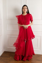 Red Peplum top and double layered sharara set with hand embroidery detailing at sleeves, neckline and borders. Paired with a ruffle dupatta.