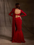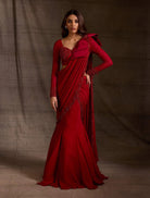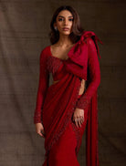 Crafted in a soft blush beige, this saree gown blends structured draping with a fluid silhouette. The embroidered mesh blouse features hand-applied floral detailing and a flattering sweetheart neckline. Cascading ruffles and delicate pearl work give the georgette skirt a feminine finish.
