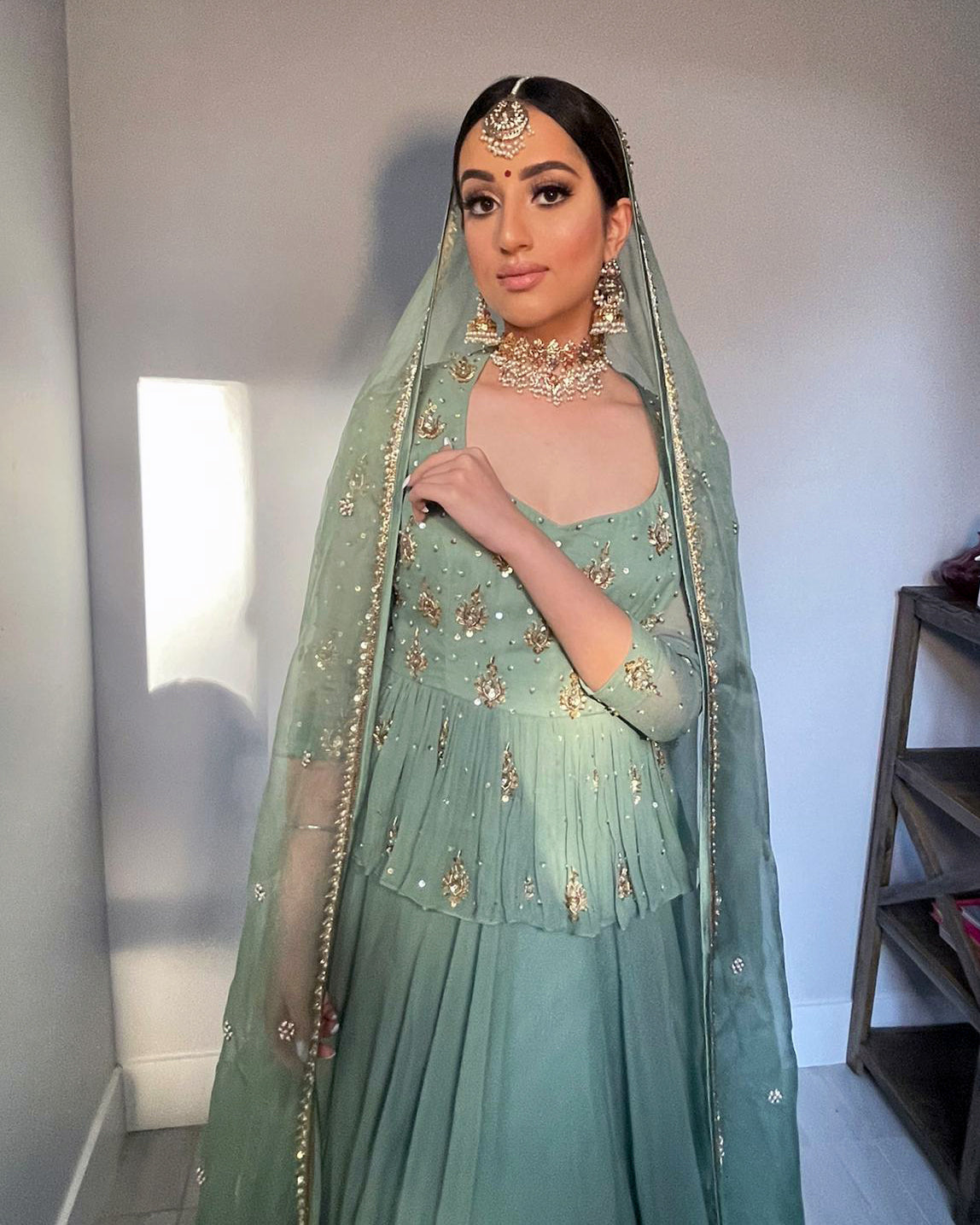 Hand embroidered peplum top with sweatheart neckline. Georgette lengha with matching net dupatta.